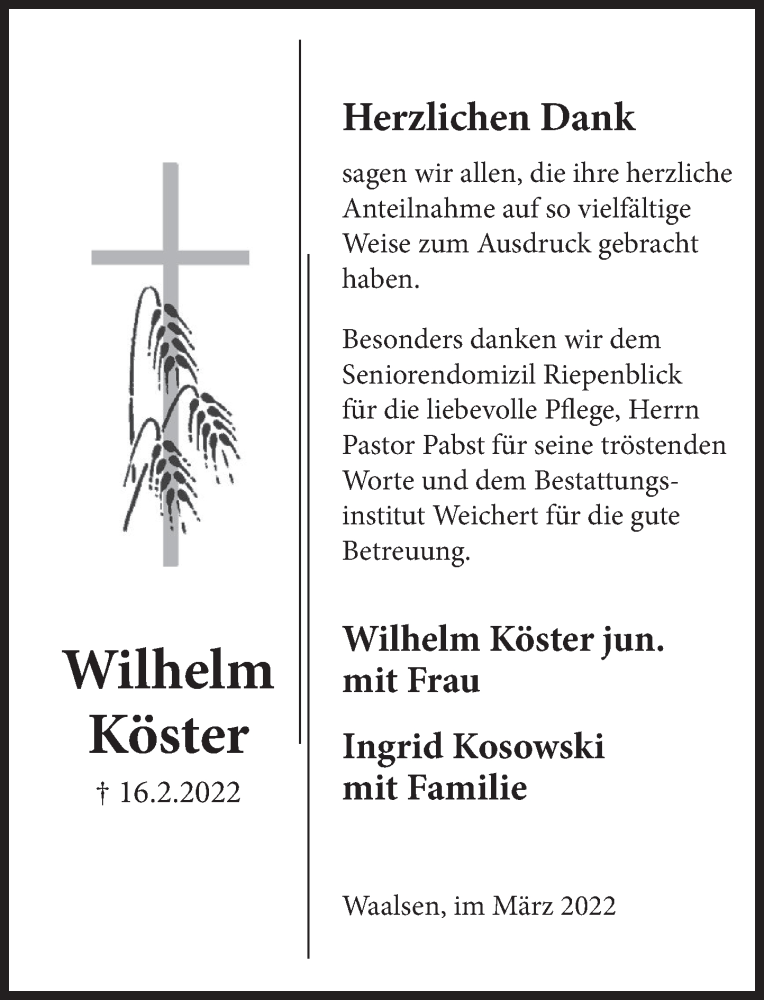 Hier finden Sie alle Traueranzeigen aus der Zeitung, die bisher für Wilhelm Köster erschienen sind. Weitere Traueranzeigen, die in der Zeitung erscheinen, werden hier ebenfalls aufgelistet
