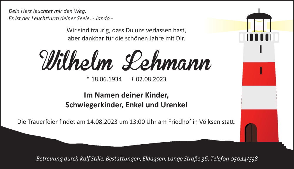 Hier finden Sie alle Traueranzeigen aus der Zeitung, die bisher für Wilhelm Lehmann erschienen sind. Weitere Traueranzeigen, die in der Zeitung erscheinen, werden hier ebenfalls aufgelistet