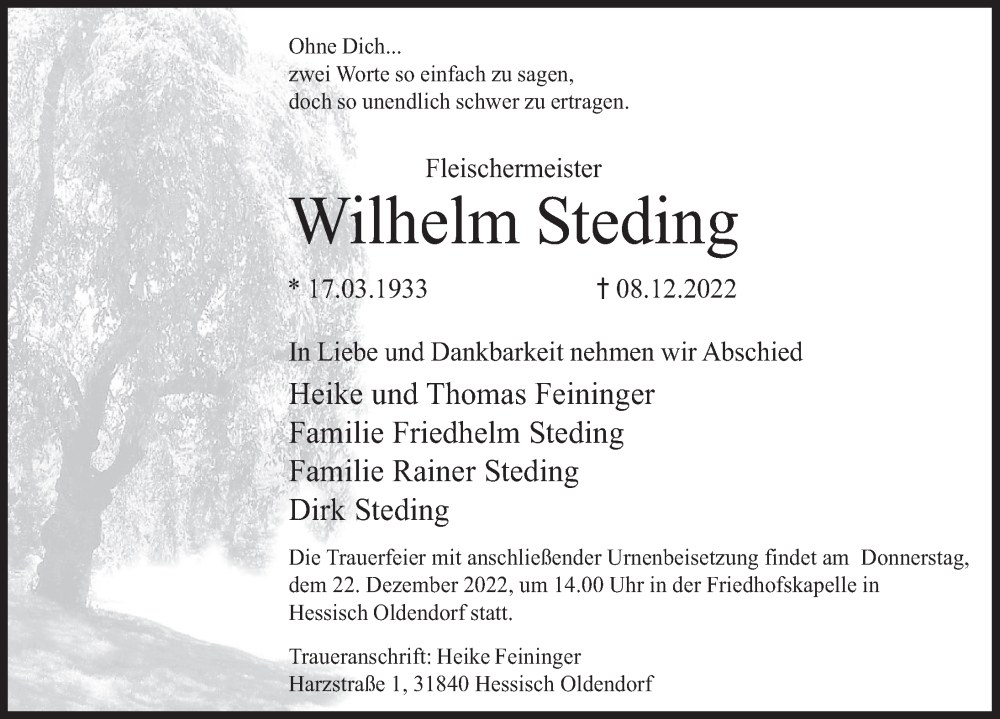 Hier finden Sie alle Traueranzeigen aus der Zeitung, die bisher für Wilhelm Steding erschienen sind. Weitere Traueranzeigen, die in der Zeitung erscheinen, werden hier ebenfalls aufgelistet