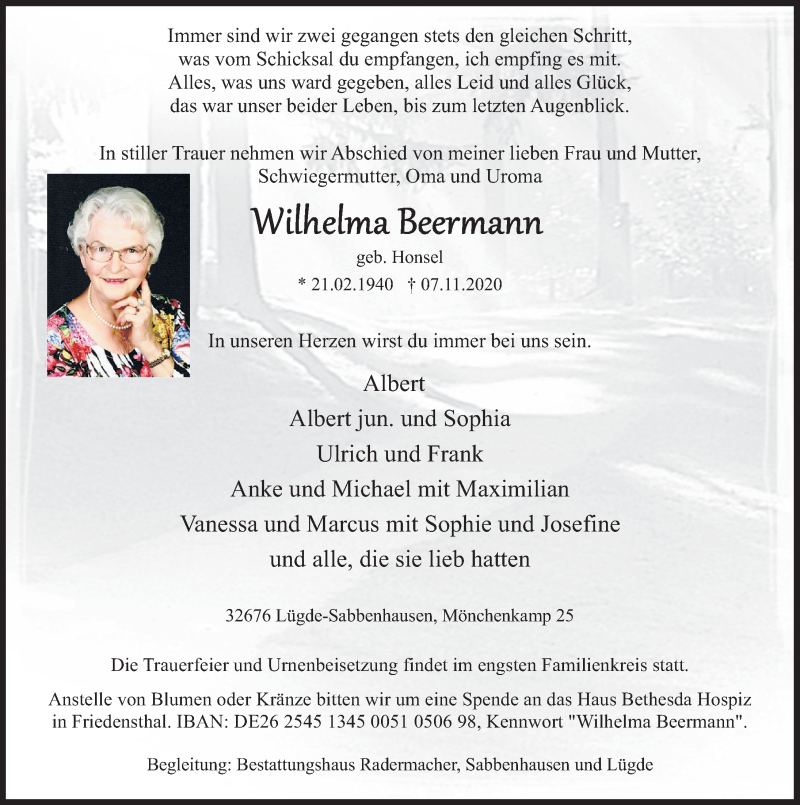 Hier finden Sie alle Traueranzeigen aus der Zeitung, die bisher für Wilhelma Beermann erschienen sind. Weitere Traueranzeigen, die in der Zeitung erscheinen, werden hier ebenfalls aufgelistet