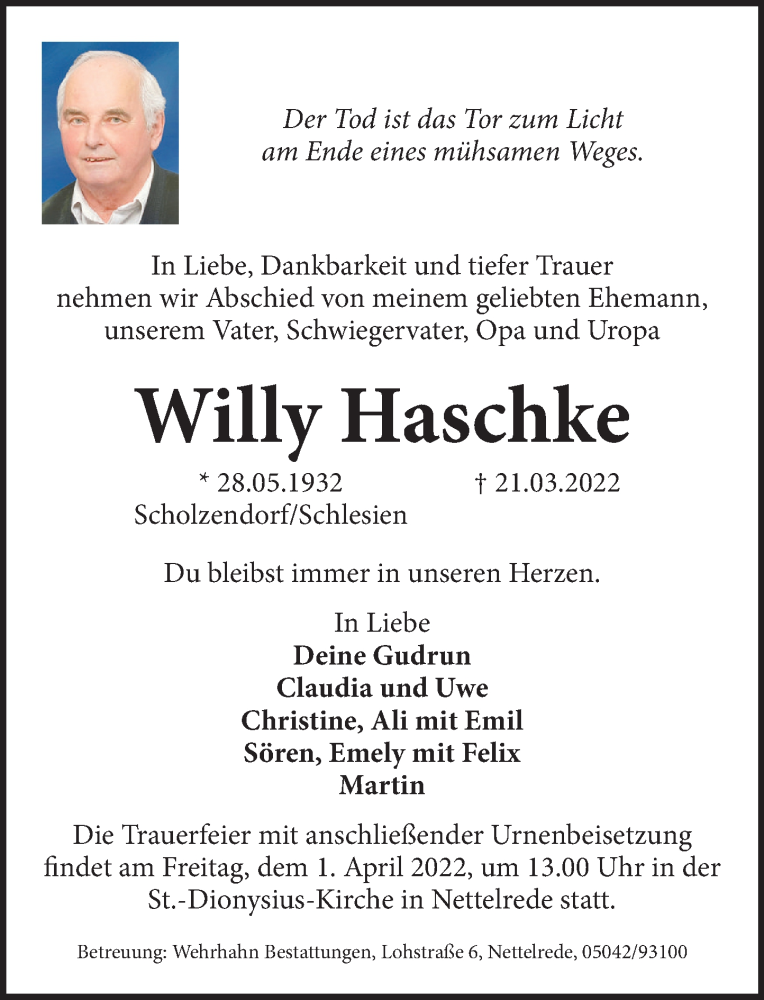 Hier finden Sie alle Traueranzeigen aus der Zeitung, die bisher für Willy Haschke erschienen sind. Weitere Traueranzeigen, die in der Zeitung erscheinen, werden hier ebenfalls aufgelistet