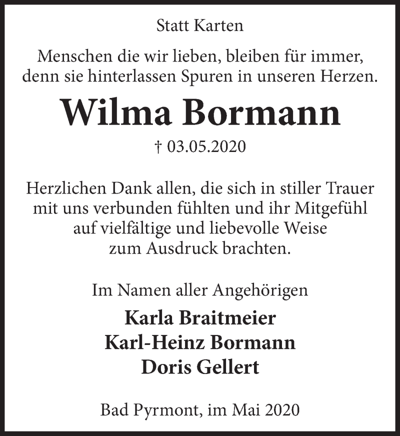 Hier finden Sie alle Traueranzeigen aus der Zeitung, die bisher für Wilma Bormann erschienen sind. Weitere Traueranzeigen, die in der Zeitung erscheinen, werden hier ebenfalls aufgelistet