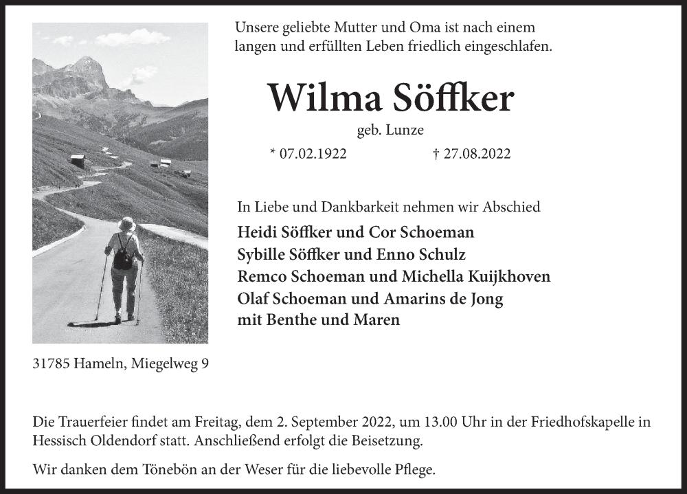 Hier finden Sie alle Traueranzeigen aus der Zeitung, die bisher für Wilma Söffker erschienen sind. Weitere Traueranzeigen, die in der Zeitung erscheinen, werden hier ebenfalls aufgelistet