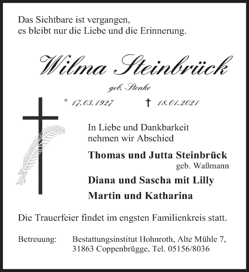 Hier finden Sie alle Traueranzeigen aus der Zeitung, die bisher für Wilma Steinbrück erschienen sind. Weitere Traueranzeigen, die in der Zeitung erscheinen, werden hier ebenfalls aufgelistet