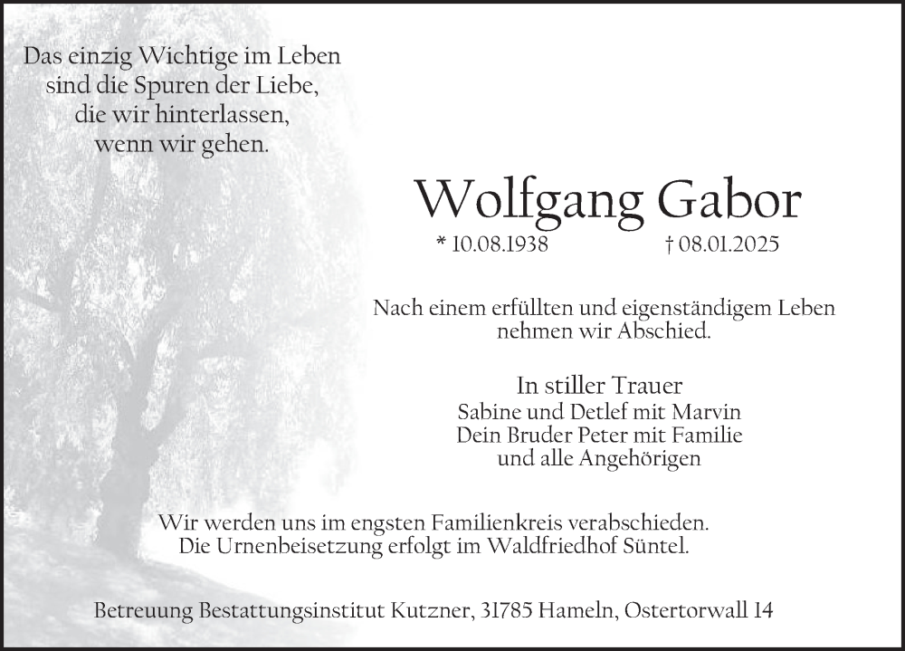 Hier finden Sie alle Traueranzeigen aus der Zeitung, die bisher für Wolfgang Gabor erschienen sind. Weitere Traueranzeigen, die in der Zeitung erscheinen, werden hier ebenfalls aufgelistet