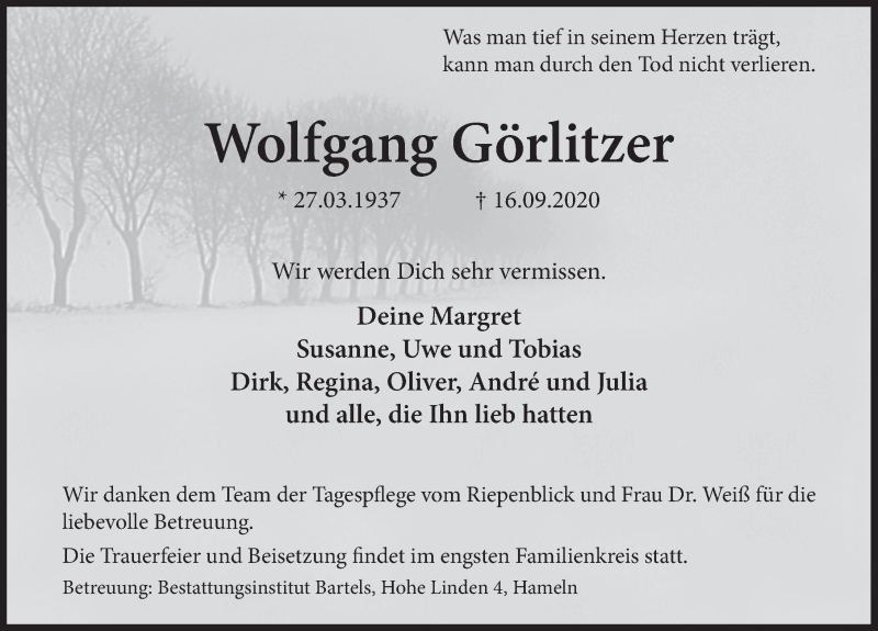 Hier finden Sie alle Traueranzeigen aus der Zeitung, die bisher für Wolfgang Görlitzer erschienen sind. Weitere Traueranzeigen, die in der Zeitung erscheinen, werden hier ebenfalls aufgelistet