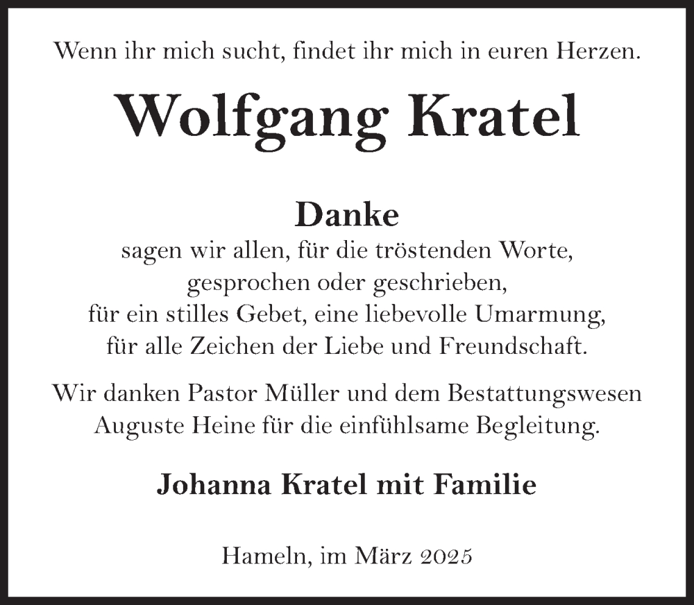 Hier finden Sie alle Traueranzeigen aus der Zeitung, die bisher für Wolfgang Kratel erschienen sind. Weitere Traueranzeigen, die in der Zeitung erscheinen, werden hier ebenfalls aufgelistet