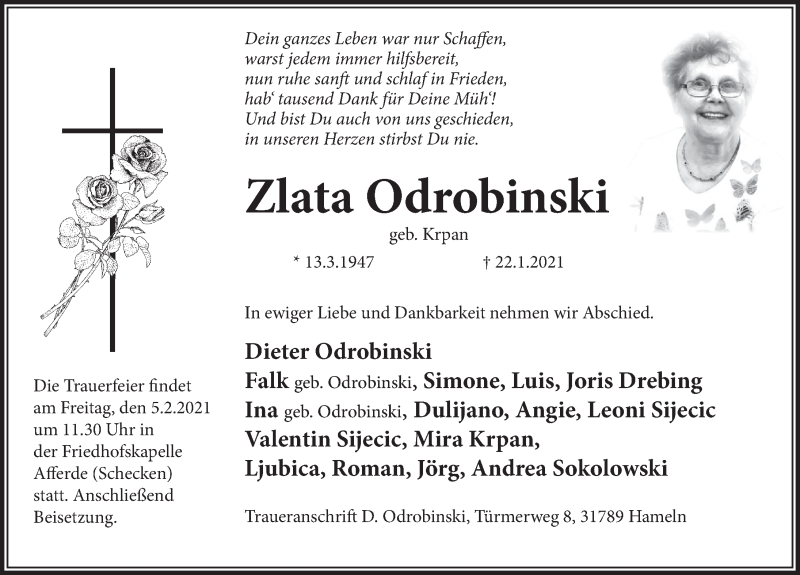 Hier finden Sie alle Traueranzeigen aus der Zeitung, die bisher für Zlata Odrobinski erschienen sind. Weitere Traueranzeigen, die in der Zeitung erscheinen, werden hier ebenfalls aufgelistet
